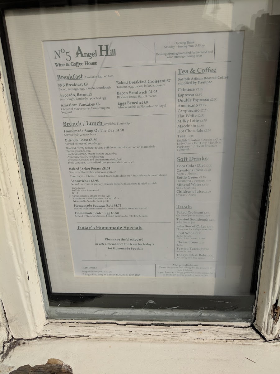 No 5 Angel Hill is a delightful café nestled in the heart of Bury Saint Edmunds that promises an enticing culinary experience. Their menu offers a diverse range of options, making it an ideal spot for any meal. Start your day with their Breakfast Croissant or indulge in the rich flavors of Eggs Benedict and Breakfast Sourdough. For lunch, don’t miss the Runny Yolk Scotch Egg or the No 5 Bagels, each crafted with quality ingredients. Guests rave about the welcoming atmosphere, exceptional service, and decadent pastries, especially the renowned coffee cake. With its outdoor seating option, it's perfect for enjoying a delicious chai latte while soaking in the scenic view of Abbey Gardens. Customer experiences highlight the staff's friendliness and attentiveness, ensuring every visit feels special. No 5 Angel Hill is not just a café; it's a community hub where food and memories come together.